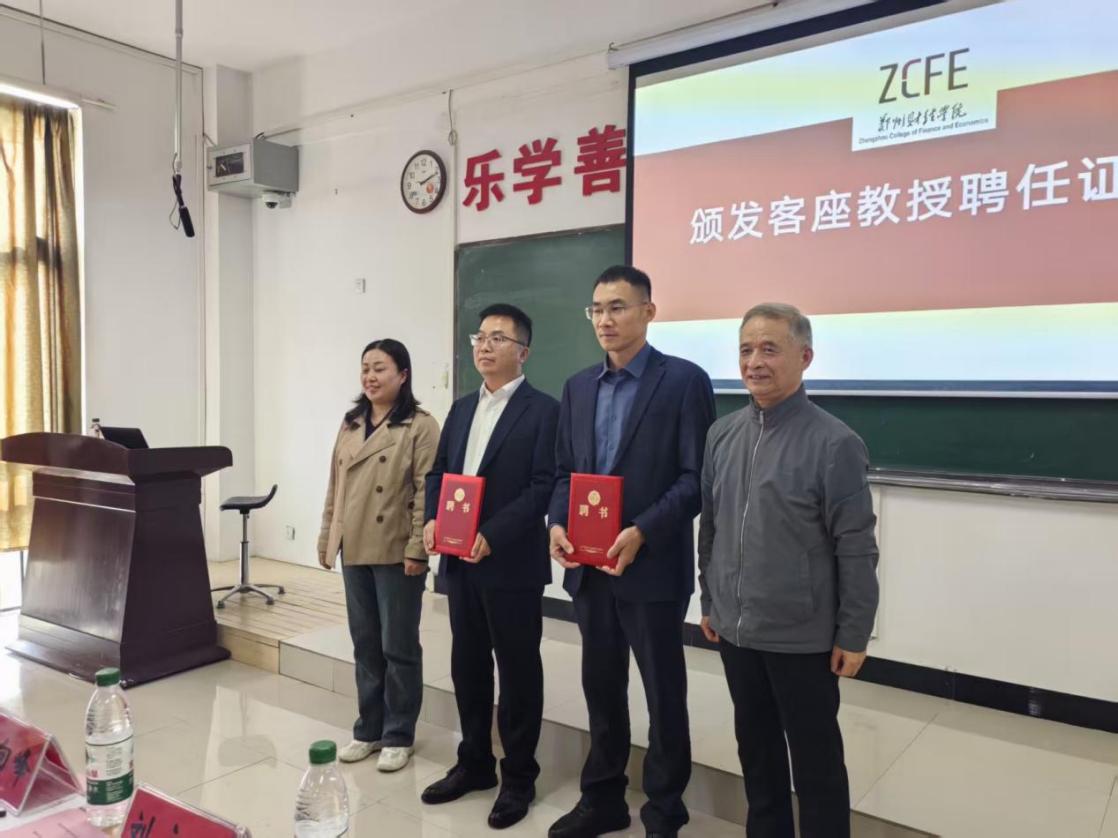 随后,教务处处长任玲玲宣读了客座教授聘任决定。正大集团河南区饲料事业资深总裁王停战、南阳正大有限公司总经理王向峰受聘为郑州财经学院客座教授。商学院院长罗党、党总支书记宋艳萍为各位企业专家颁发聘任证书。