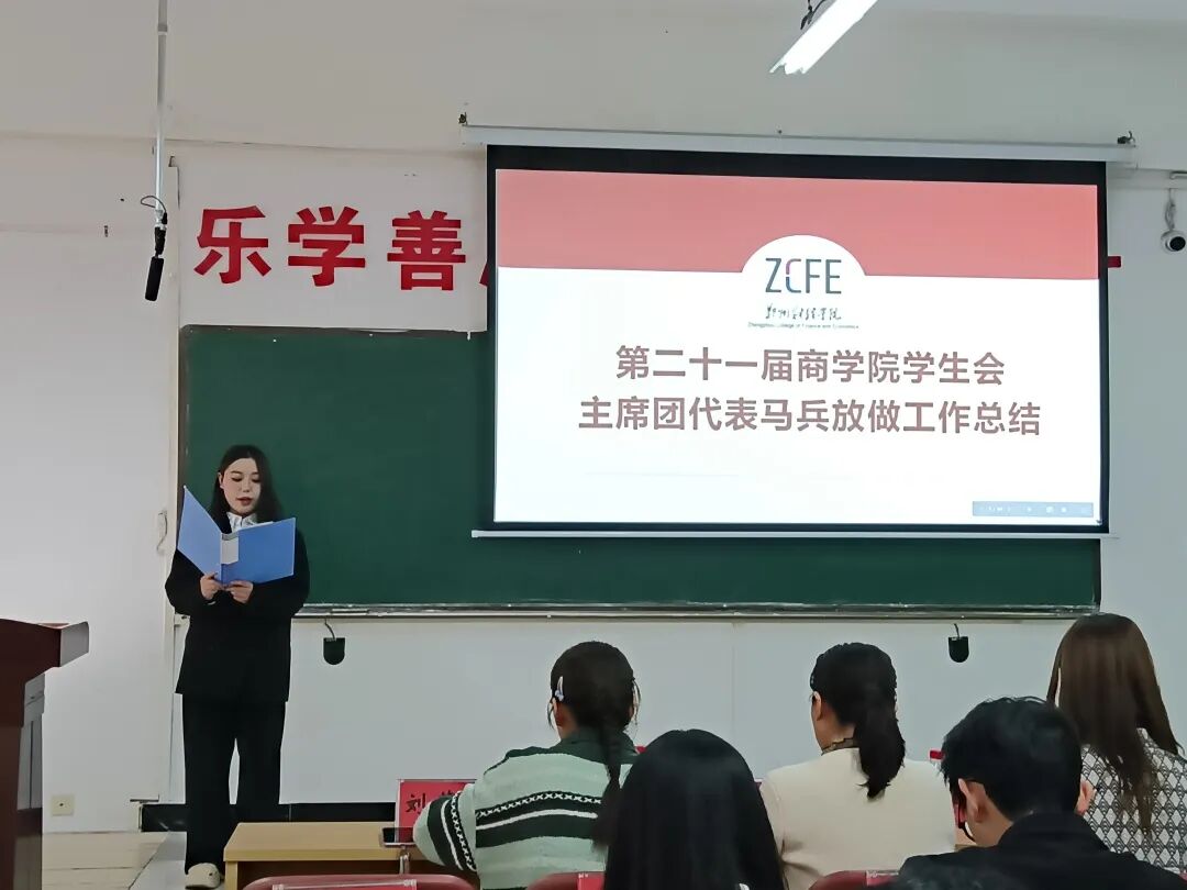 随后,第二十一届商学院学生会主席团代表马兵放做工作总结。她从组织建设、活动开展、服务同学等多个维度,回顾了过去一年学生会的工作历程,分享了工作中的经验与感悟,也坦诚地指出了存在的不足,为新一届学生会的工作提供了宝贵的参考。