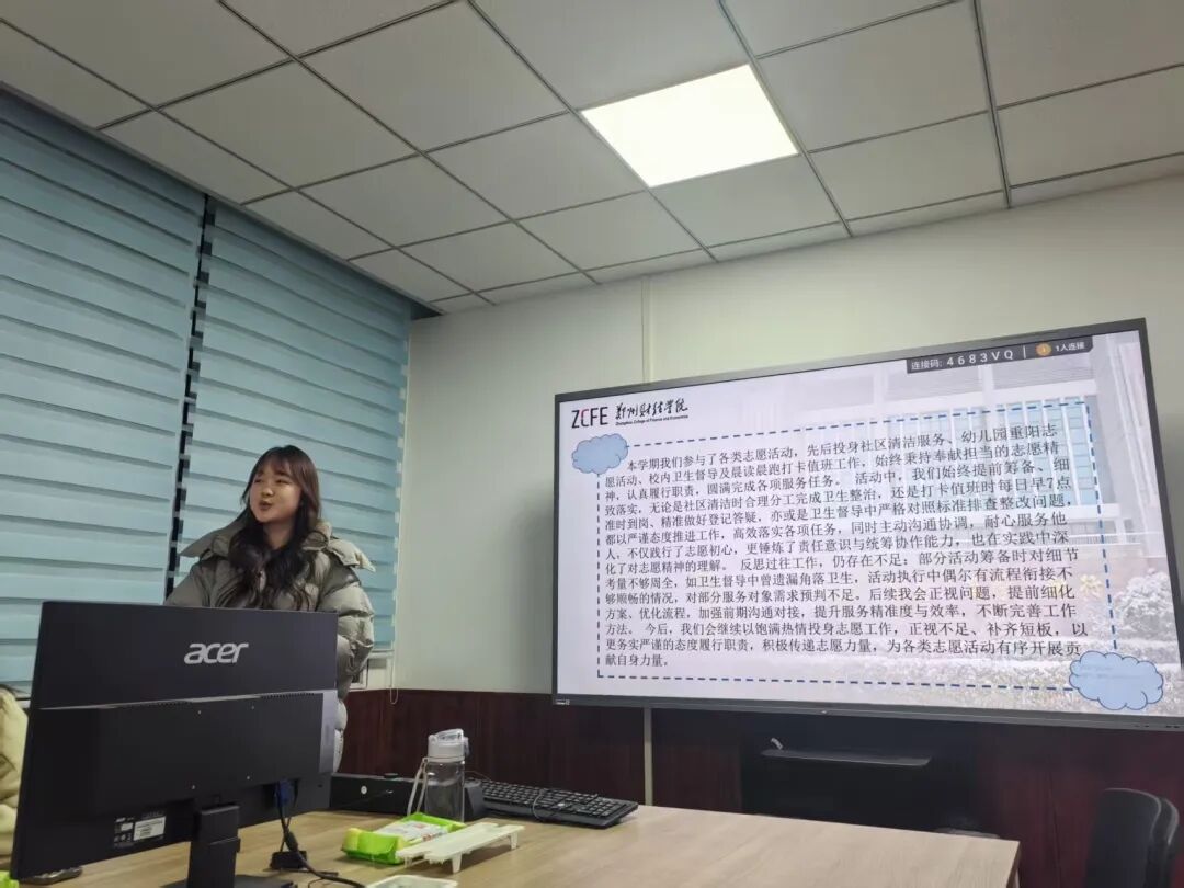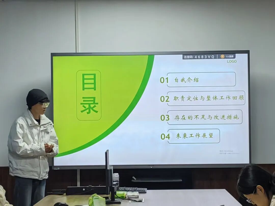 随后,述职环节正式拉开帷幕。学习部、办公室、组织部、权益部、宣传部、督导部、文体部等部门部长依次上台,结合精心制作的PPT,从部门职责履行、本学期重点工作开展情况、特色活动成果、工作中存在的问题及未来工作计划等方面进行了全面且细致的述职汇报。各部门汇报内容详实、条理清晰,既展现了一学期以来的辛勤付出与亮眼成绩,也体现了对自身工作的深刻反思与规划。在各部门述职完毕后,郑璐琪对各部门的工作进行了逐一点评,针对各部门的特色工作给予了高度赞扬,对工作中存在的短板提出了具体的改进建议,并结合学院发展规划,为各部门下一阶段的工作指明了方向。