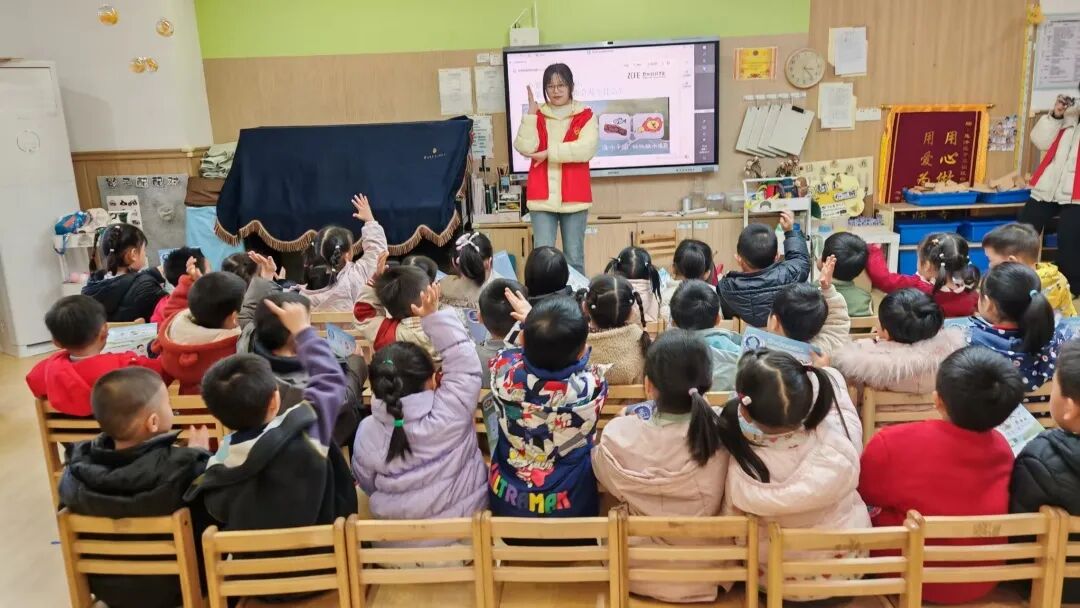 活动伊始,志愿者们以“我是水宝宝!”为主题,通过生动的动画课件和趣味讲解,向孩子们介绍了水的形态变化与生命意义。课堂上,志愿者们结合生活场景提问:“水有哪些用处呀?”“我们可以怎样节约每一滴水?”孩子们积极举手、踊跃发言,分享自己的生活发现,回答正确的小朋友还获得了可爱的小盲袋作为奖励,现场气氛热烈又活泼。